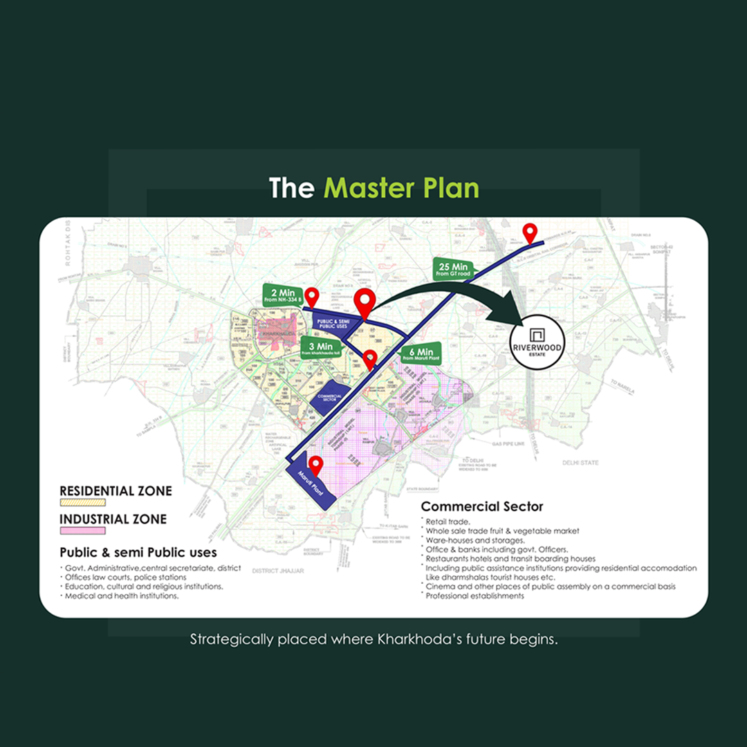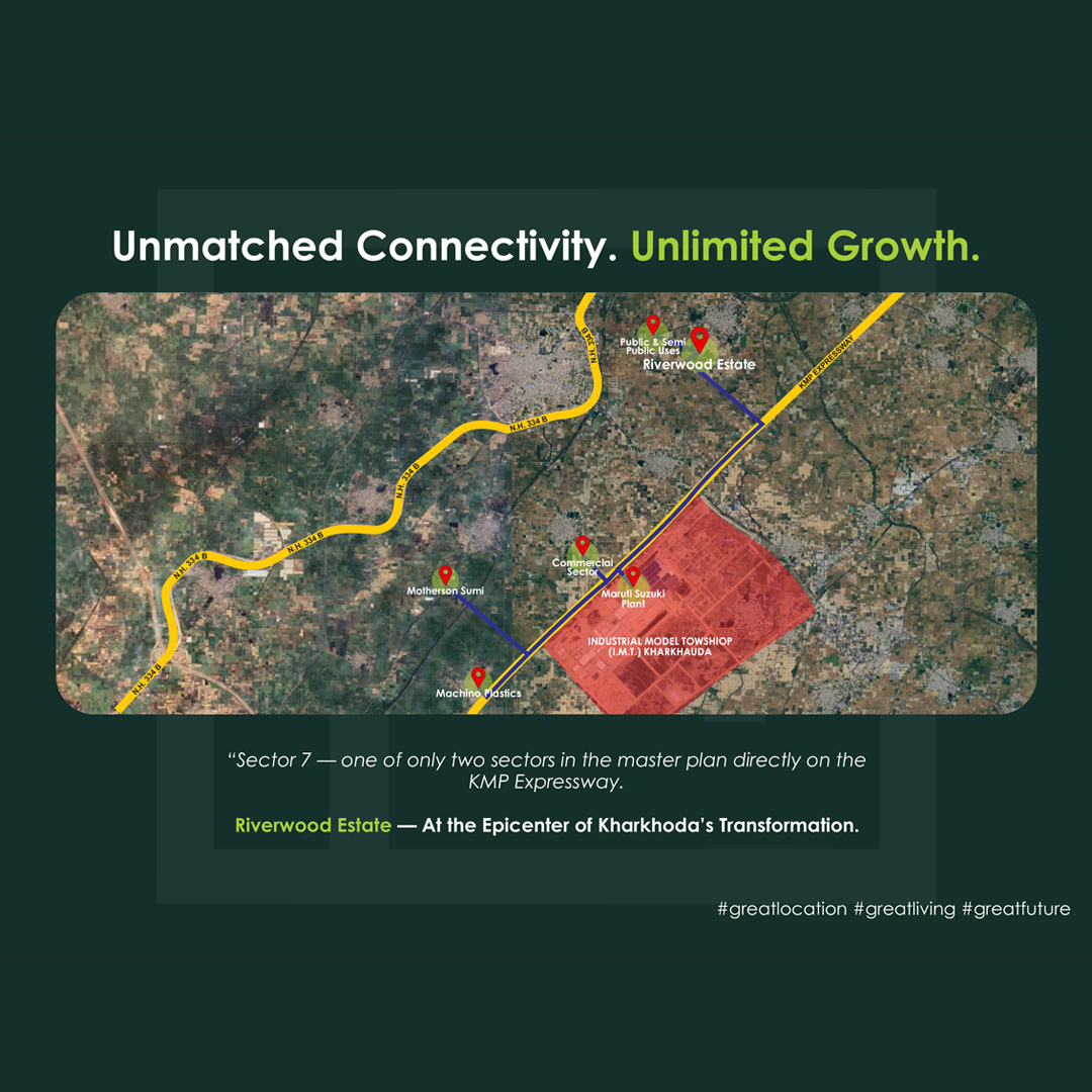 Located strategically in Sector 7, Kharkhoda, Riverwood Estate enjoys unmatched connectivity to key NCR locations via KMP Expressway and NH-9, while being minutes away from the upcoming Global City and industrial development zones.